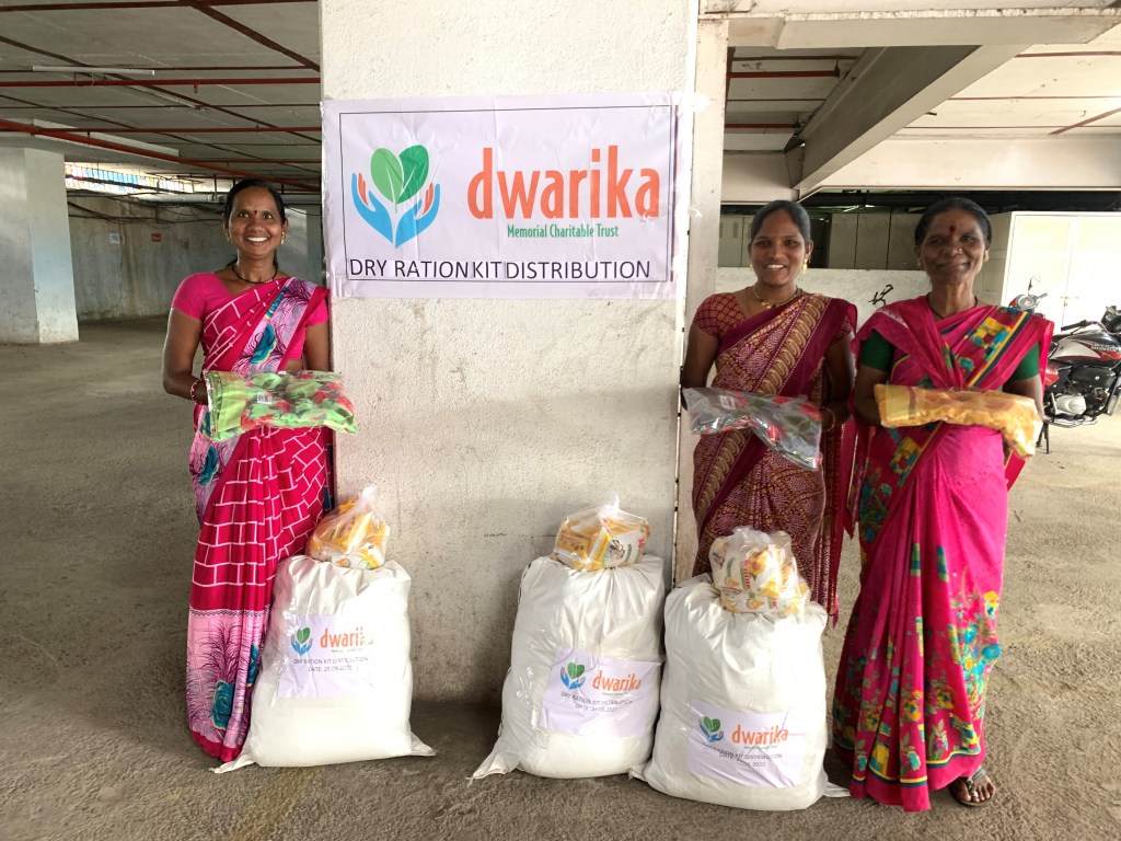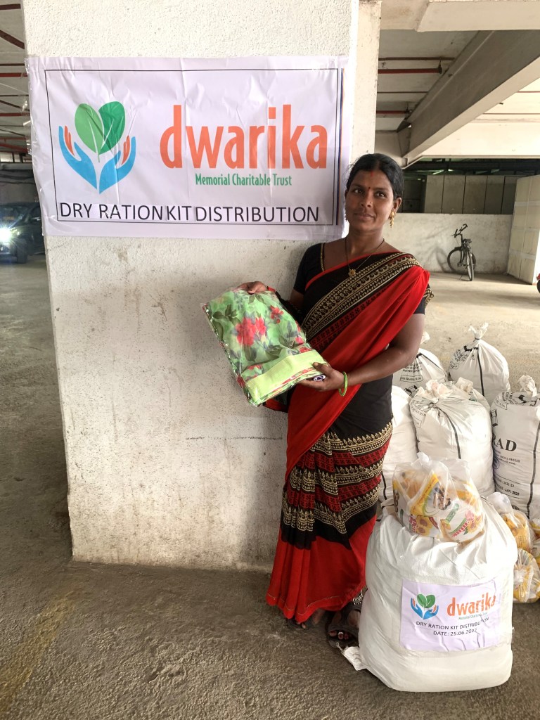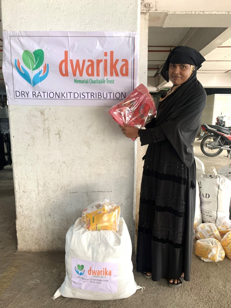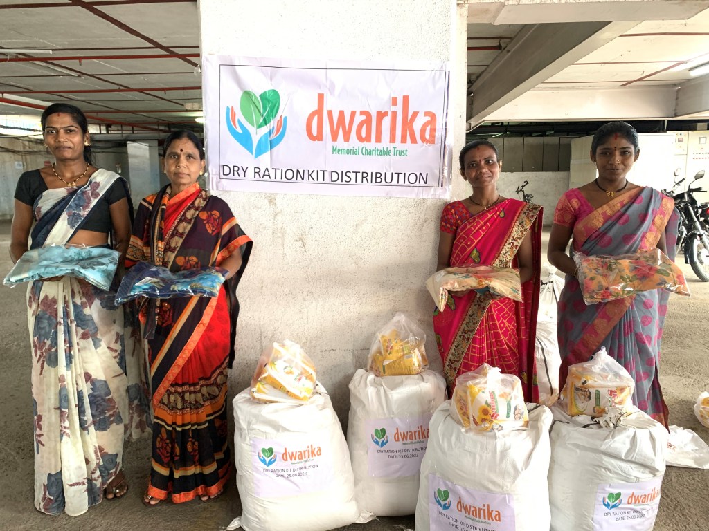 On June 25, 2022, Dwarika Memorial Charitable Trust distributed dry ration kits and saris to 21 women. The women who received these items are employed as domestic workers in Pune. They work in households where they clean, wash clothes and dishes, cook, and provide child and elderly care. The dry ration kits and saris we distributed will help these women and their families make ends meet. Each dry ration kit contained a 2-month supply of rice, spices, flour, lentils, sugar, oil and other cooking ingredients.